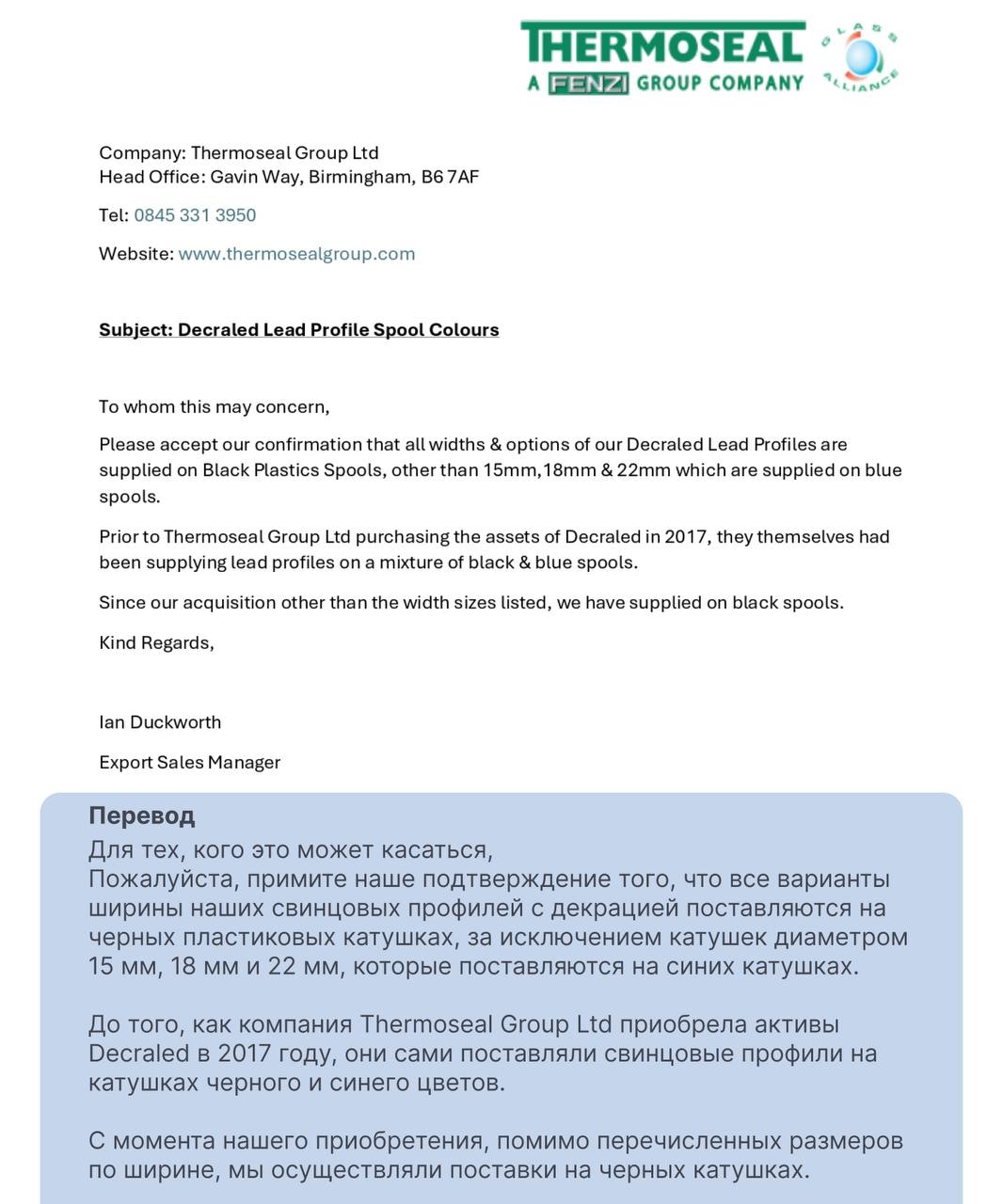 Прикладываем официальное письмо от производителя, подтверждающее подлинность черной свинцовой ленты THERMOSEAL.